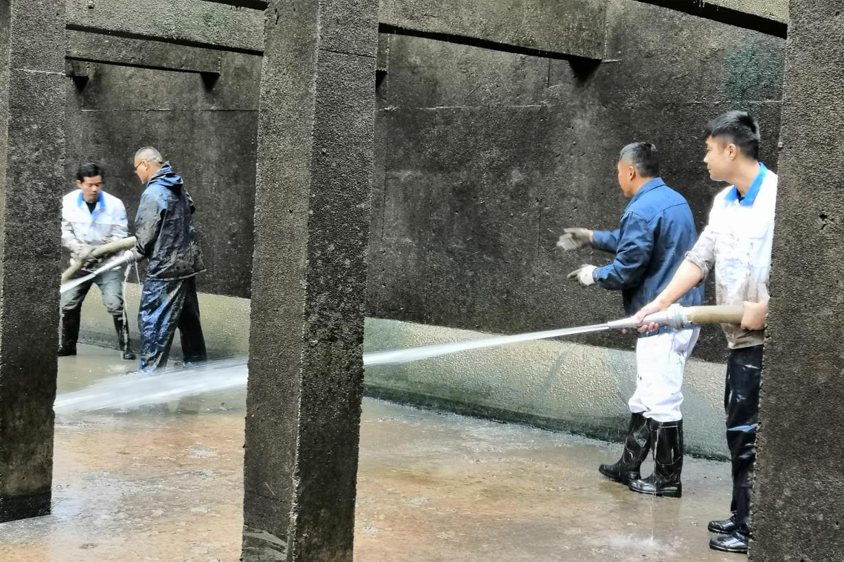 清洗过程中,同志们撸起袖子加油干,先后对沉淀池进行了抽水、排泥、洗刷淤泥等清洗步骤。大家分工协作、配合默契,不怕脏、不怕累,个个忙的满头大汗也不闲着,每个人的身上都透着一股热爱集体,凝聚团队力量的精神,形成了一道亮丽的风景线。