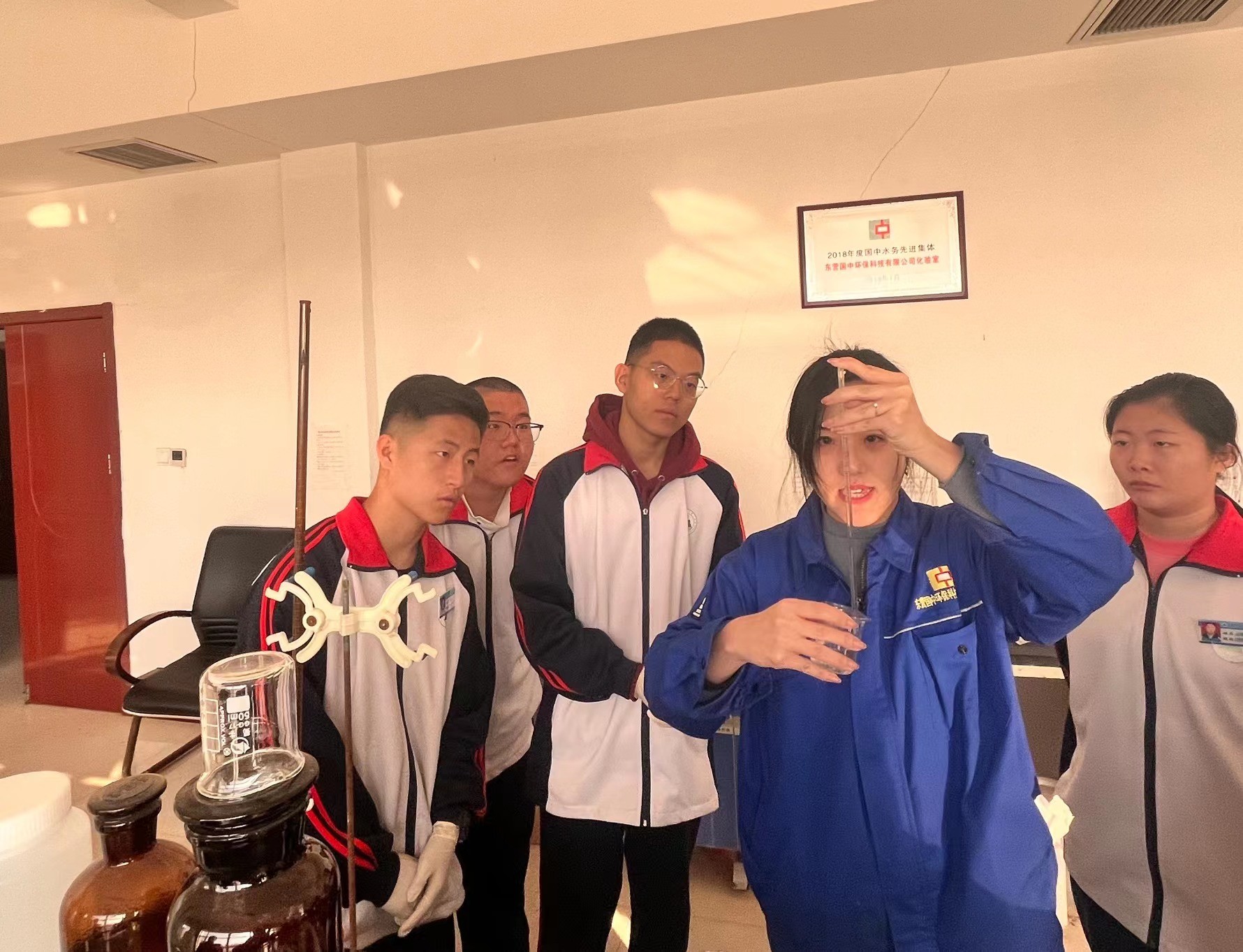 我们生活中产生的大量废水都去哪了呢?”针对同学们的疑惑,公司运行部李昂、郭立、温阳分别带领学生们参观了格栅间、沉淀池、出水口等工艺设备,并用通俗易懂的语言向学生们讲解了污水由浊变清的过程。同学们一边观看各个车间的生产运行情况,一边认真听取污水处理的工艺流程,通过走、看、听等形式,亲身体验,对污水处理过程有了直观的认识,并对污水处理难度及精湛的工艺感到赞叹。
