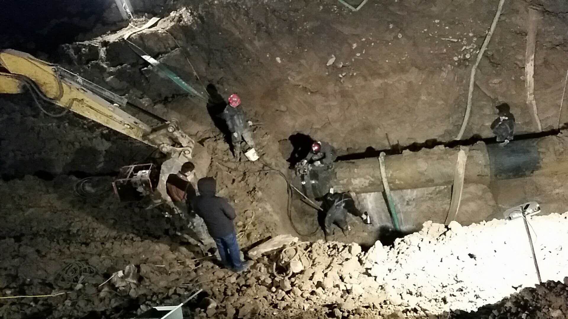 10时30分,汉中城区东郊二水厂DN800主回水管发生爆管。次日即为除夕,如马上关阀维修,将会造成除夕及大年初一全城缺水。公司领导依据实际情况商议后,果断决策暂不维修,调整供水调度计划连夜产水两个水厂的4个大蓄水池蓄满,保证除夕全城用水高峰,待第二日视实际情况处理。同时,安排挖掘机临时将漏水引东南侧的较低洼地,防止漏水对农田和周围在建道路污水管道施工工地造成影响。