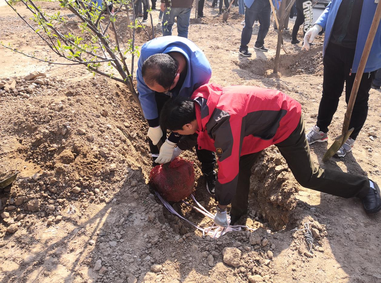 植树地点位于豪峰公司高效池周围这一地块原为临时堆放地,清理腾空后用于绿化建设。大家铁锹来到植树现场,三人一组,五人一群个个争先恐后,有挥锹铲土,有放苗回填,有提水浇灌,多彩的身影在阳光下忙碌着,植树现场热火朝天。经过一个多小时的辛勤劳动,一颗颗果树、桃树在明媚的春光里生根发芽给厂区增添一抹新绿